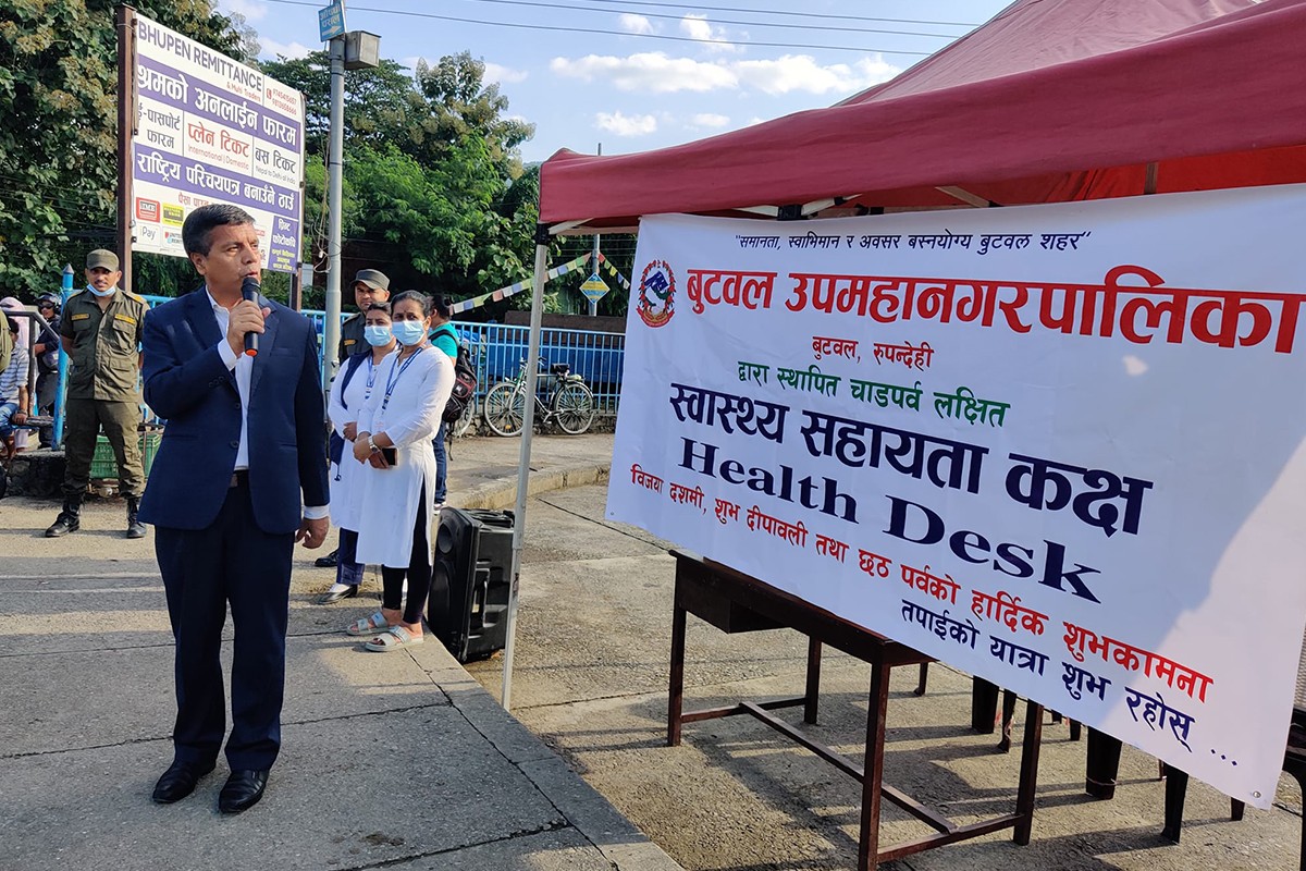 बुटवल- दसैँ र तिहारलाई लक्षित गरी बुटवल उपमहानगरपालिकाले नयाँ बसपार्कमा यात्रु सहायता कक्ष स्थापना गरेको छ। चाडबाडको समयमा यात्रुहरू अलपत्र पर्ने, ठगिने, असुरक्षा हुने र स्वास्थ्यसम्बन्धी समस्या हुनसक्ने भएकाले बिहीबारदेखि बसपार्कमा सहायता कक्ष स्थापना गरेको हो।
