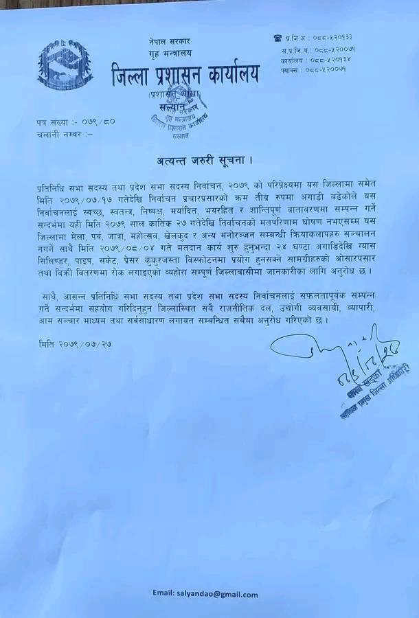 मङ्सिर ४ गते हुने निर्वाचनलाई लक्षित गर्दै स्वच्छ, निष्पक्ष, मर्यादित, भयरहित र शान्तिपूर्ण तवरबाट निर्वाचन सम्पन्न गर्ने ध्येयले आज आइतबारदेखि निर्वाचन सम्पन्न नहुदा सम्म ।मेला महोत्सव ,जात्रा खेलकुद तथा मनोरञ्जनका कार्यक्रममा पूर्ण रोक लगाइएको सहायक प्रमुख जिल्ला अधिकारी थमन खड्काले जानकारी दिनु भयो ।