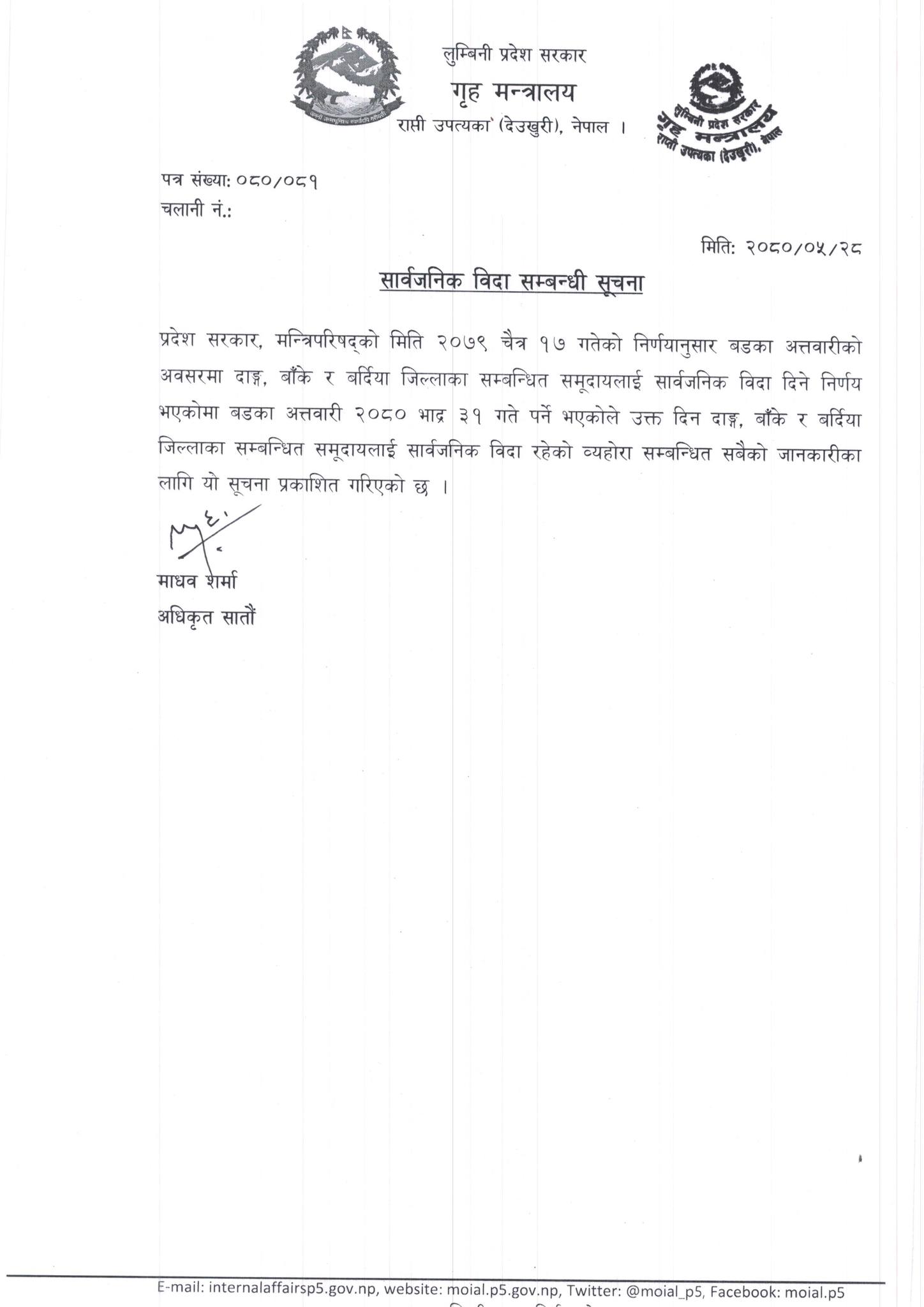 ‘भदौ ३१ गते दाङ, बाँके र बर्दियाका सम्बन्धित समुदायलाई सार्वजनिक बिदा रहेको ब्यहोरा सबैमा जानकारी गराउँदछौँ,’ प्रदेश सरकारका अधिकृत (सातौँ) माधव शर्माले बिहीवार जारी विज्ञप्तिमा भनिएको छ ।