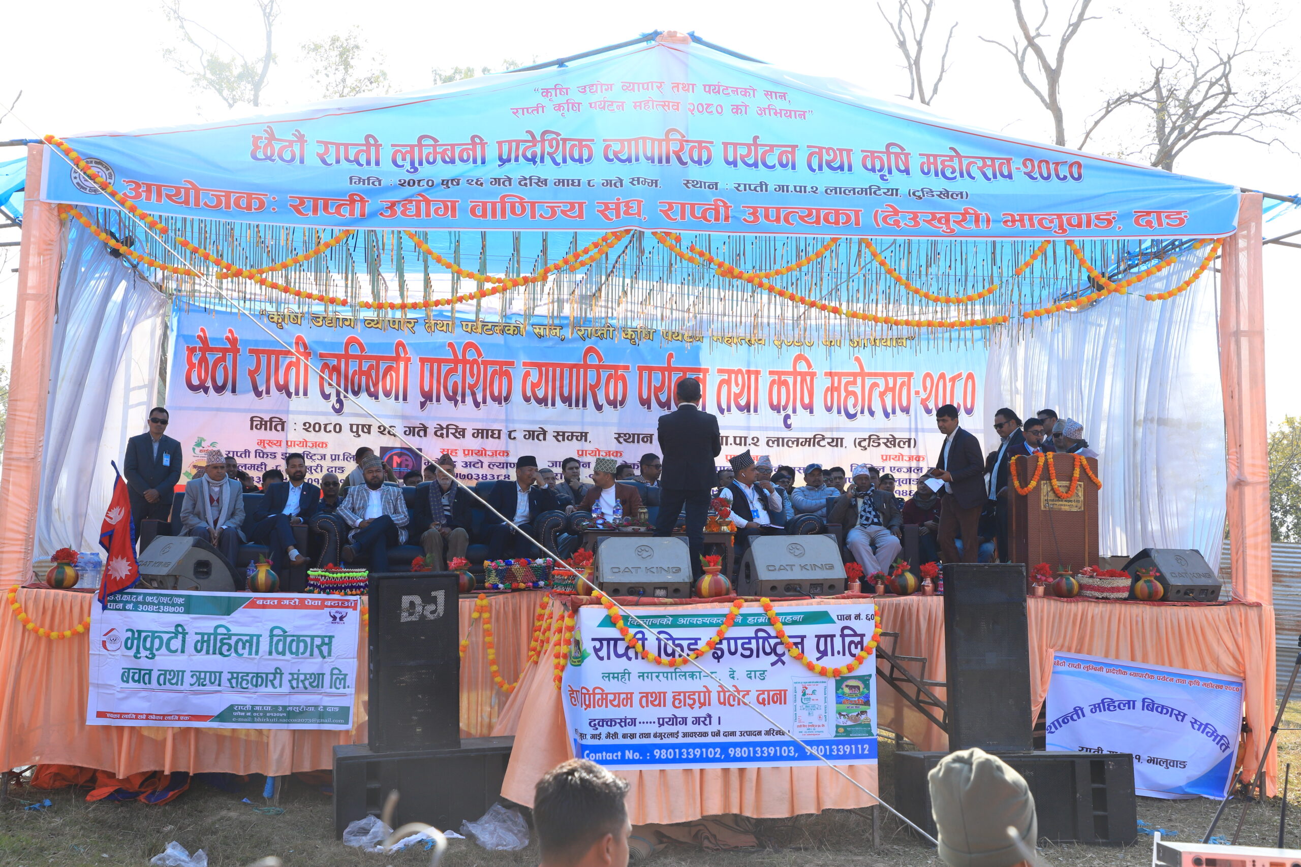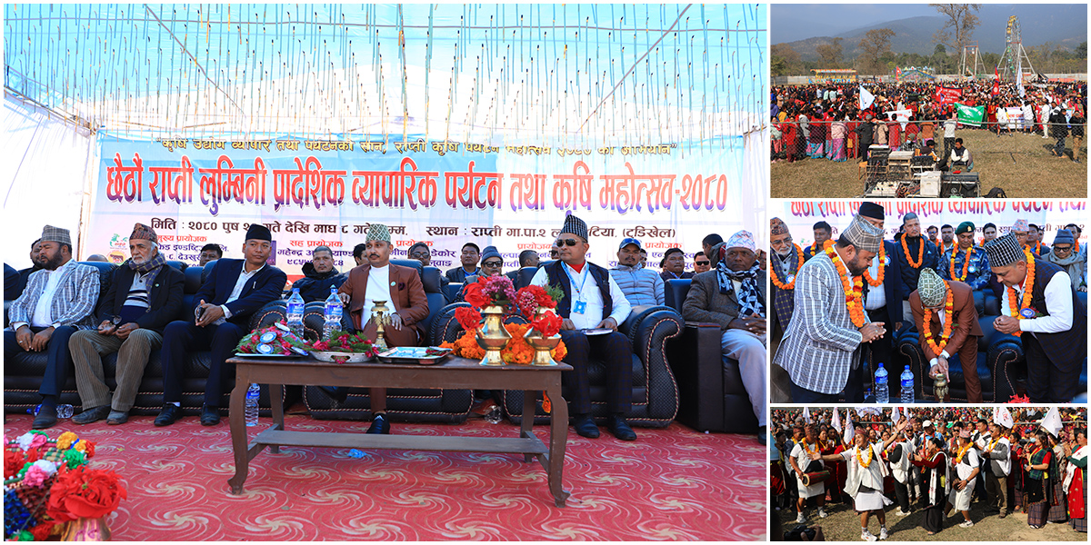 राप्ती उद्योग बाणिज्य संघको आयोजनामा पुष २६ गतेदेखि माघ ८ गतेसम्म चल्ने ‘छैठौं राप्ती–लुम्बिनी प्रादेशिक व्यापारिक, पर्यटन तथा कृषि महोत्सव २०८०’ को बिहिबार उद्घाटन गरीएको हो ।‘कृषि उद्योग, व्यापार तथा पर्यटनको शान, राप्ती कृषि पर्यटन महोत्सव २०८० को अभियान’ भन्ने मुल नाराका साथ संचालन हुन लागेको महोत्सवको बिहिवार लुम्बिनी प्रदेशका उद्योग, वाणिज्य, श्रम तथा यातायात मन्त्री सरोज थापा(रोज राणा)ले उद्घाटन गरेका छन् ।
