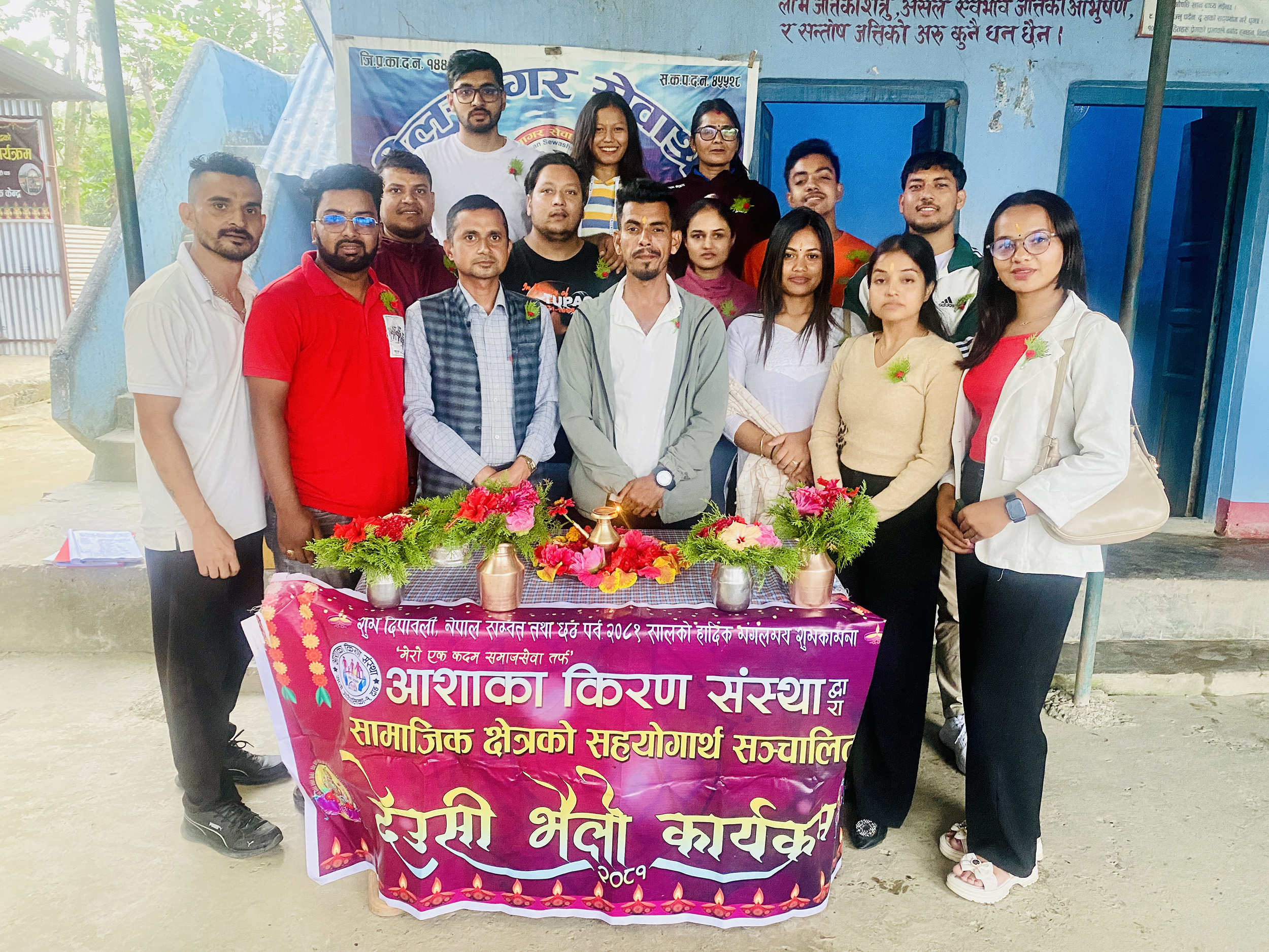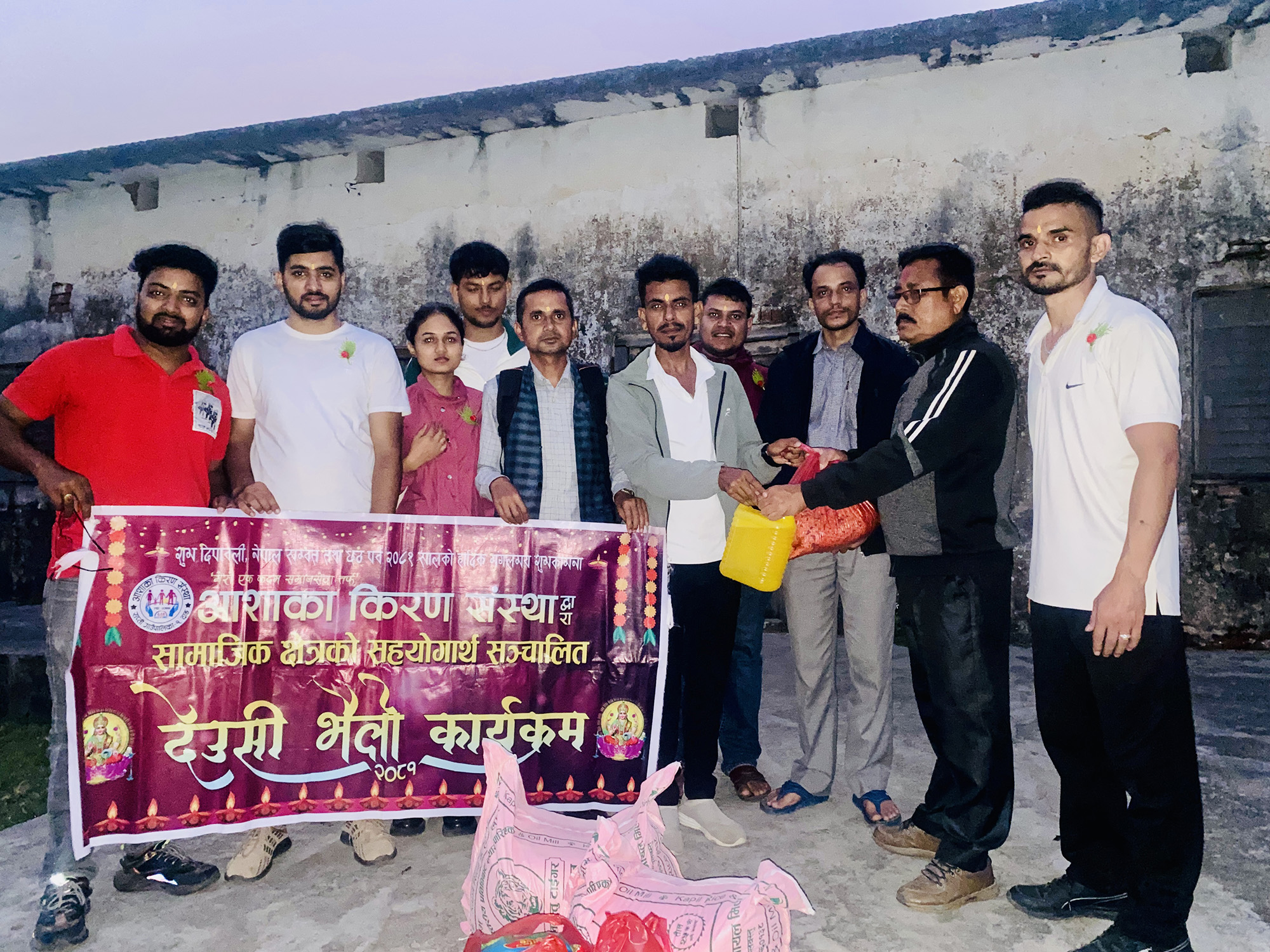 भालुवाङ २४ कार्तिक । दाङको राप्ती गाउँपालिकामा रहेको आशाका किरण संस्थाले सञ्चालन गरेको देउसीभैलोको रकम सामाजिक कार्यमा खर्च गरेको छ ।संस्थाका अध्यक्ष अशोक बेल्वासेको नेतृत्वको टोलीले राप्ती गाउँपालिका वडा नम्बर ८ पिपरीमा रहेको निलसागर सेवा आश्रम र वडा नम्बर २ लालमटिया स्थित आदर्श नमुना माध्यमिक विद्यालयमा रहेको दृष्टिविहिन छात्राबासमा खाद्यन्न सहयोग गरेको छ । भैलोबाट संकलित कुल रकमबाट खर्च कटाएर बचेको रकम मध्ये सामाजिक क्षेत्रमा ५० प्रतिशत रकम खर्च गर्ने निर्णय भए बमोजिम हालका लागि १० हजार रुपैयाँबाट आश्रम र छात्राबासमा चामल, दाल, नुन, तेल, फलफूल, भुजा, बिस्कुट लगायतका खाद्य सामाग्री सहयोग गरेको छ ।