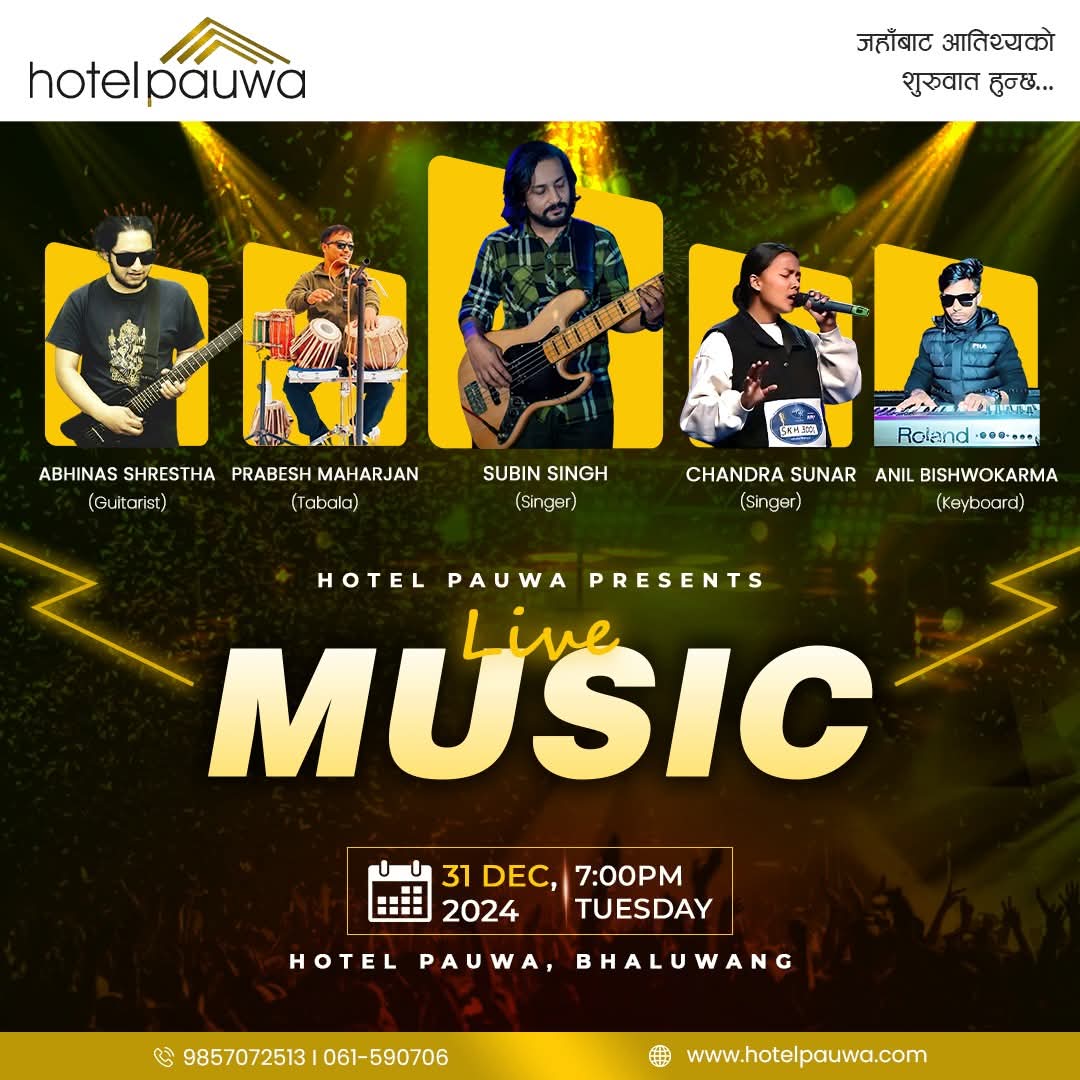 अंग्रेजी नयाँ वर्ष २०२५ को शुभारम्भका अवसरमा होटलले पुस १६ साँझ ७ बजेदेखि १२ बजेसम्म बृहत सांस्कृतिक कार्यक्रम गर्ने होटल पौवा भालुवाङका म्यानेजर श्याम न्यौपानेले जानकारी दिए । कार्यक्रममा रामजी खाडको विशेष प्रस्तुती रहनुको साथै गायक सुविन सिंह एण्ड ब्याण्डको साँगितिक प्रस्तुति रहने न्यौपानेले बताए । उक्त बृहत सांस्कृतिक कार्यक्रम गायक रामजी खाड सँगै चन्द्रा सुनार, तबला मादल बादक प्रवेश महर्जन, गितारिस्ट अभिनाष श्रेष्ठ र किबोर्डमा अनिल विश्वकर्माको सहभागिता रहने छ । कार्यक्रममा प्रवेश निःशुल्क रहेको होटलले जानकारी दिएको छ ।