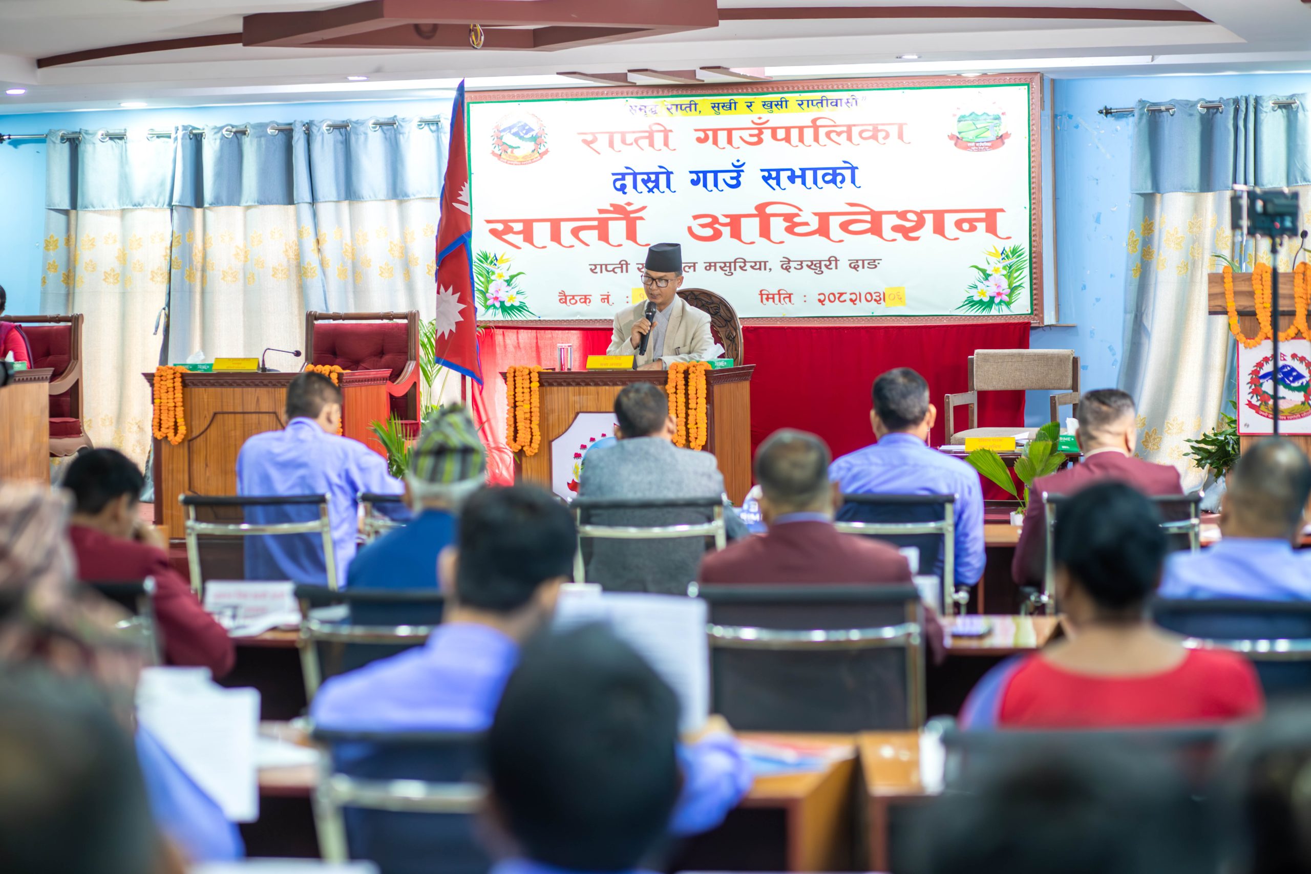 गाउँसभामा पालिकाले हालसम्म हासिल गरेका उपलब्धिहरू जानकारी गराउँदै नीति तथा कार्यक्रम सार्वजनिक गरिएको हो। नीति तथा कार्यक्रम प्रस्तुत गर्दै गाउँपालिका अध्यक्ष विष्टले समृद्ध र विकसित राप्ती निर्माण गर्ने लक्ष्यका साथ अगाडि बढिरहेको बताउनुभयो। उहाँले सीमित स्रोत र साधनका बीच जनताको आवश्यकता र अपेक्षालाई प्राथमिकता निर्धारण गरी योजनाबद्ध रूपमा कार्यान्वयन गरिने स्पष्ट पार्नुभयो।