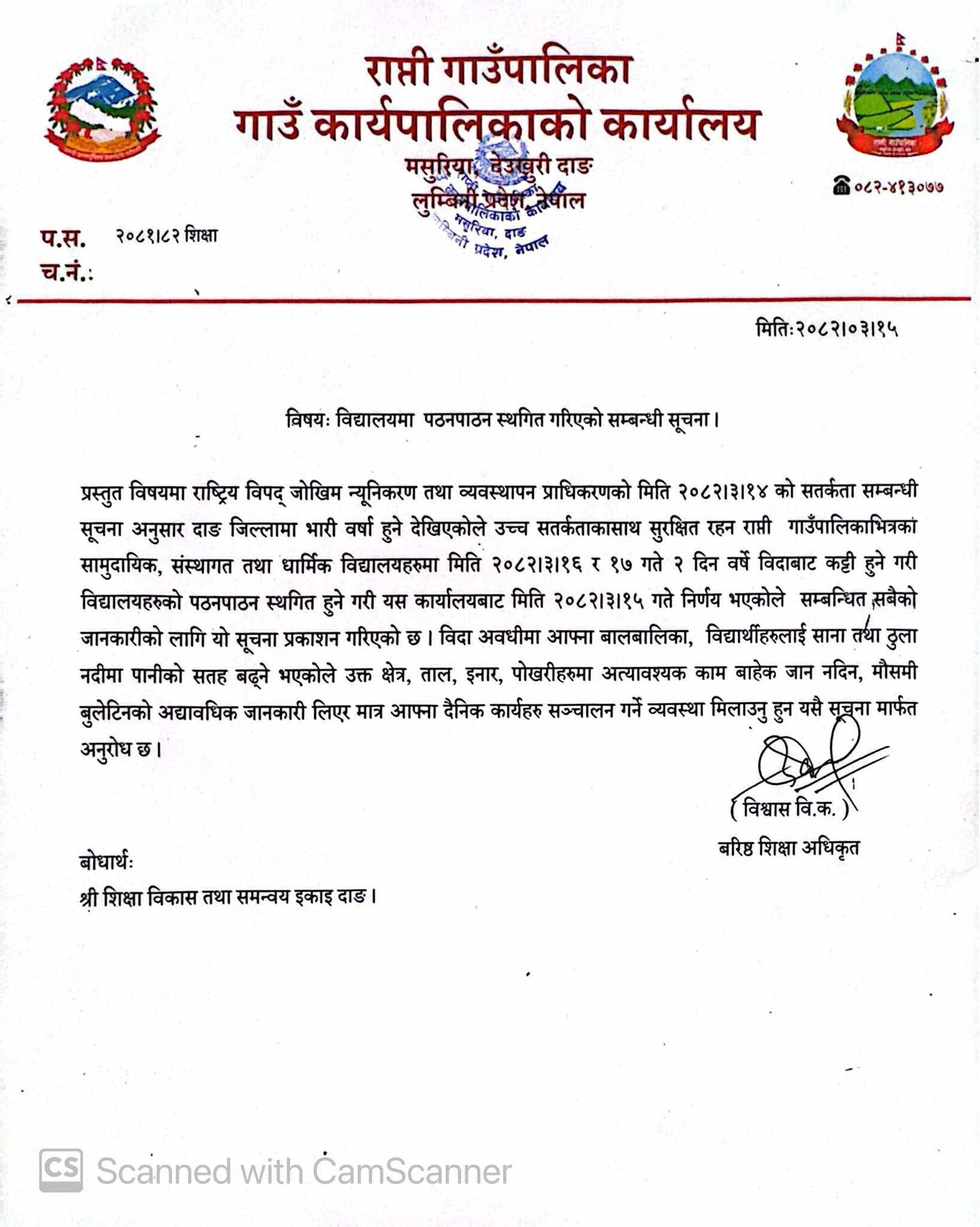 राप्ती गाउँपालिकाको शिक्षा शाखाले आइतबार जारी गरेको सूचनामा असार १४ गते राष्ट्रिय विपद् जोखिम न्यूनीकरण तथा व्यवस्थापन प्राधिकरणले जारी गरेको सतर्कता सम्बन्धी सूचनाका आधारमा यस्तो निर्णय गरिएको उल्लेख गरिएको छ। उक्त बिदा वर्षे बिदाबाट कट्टी हुने पनि सूचनामा स्पष्ट गरिएको छ।