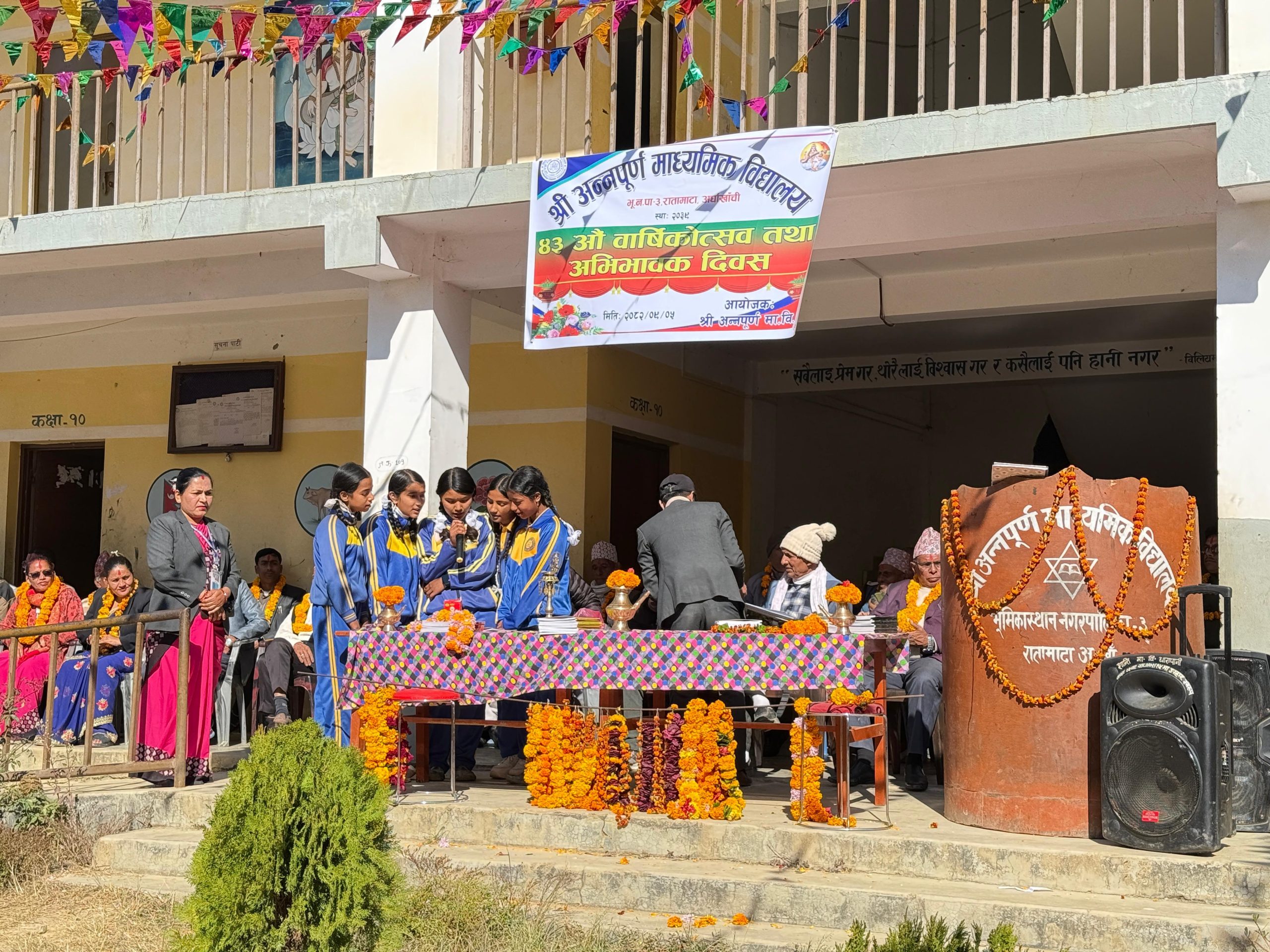 कार्यक्रमका अध्यक्ष तथा विद्यालय व्यवस्थापन समिति अध्यक्ष नारायण प्रसाद भुसालले विद्यालय स्थापनादेखि हालसम्मको यात्रा, उपलब्धि र चुनौतीबारे प्रकाश पार्दै सबै सरोकारवालाको निरन्तर सहयोगकै कारण विद्यालय आजको अवस्थामा आइपुगेको बताउनुभयो।