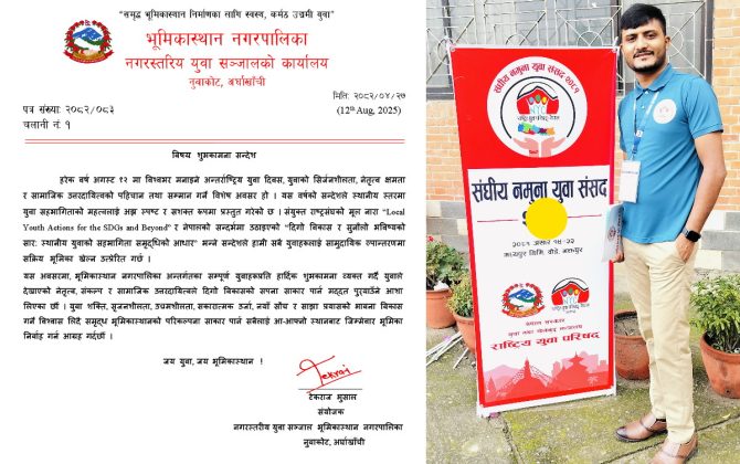 अन्तर्राष्ट्रिय युवा दिवस: भूमिकास्थान युवा संजालकाे सन्देश युवालाई नेतृत्व, सिर्जनशीलता र सामाजिक उत्तरदायित्वमा सक्रिय हुन आह्वान